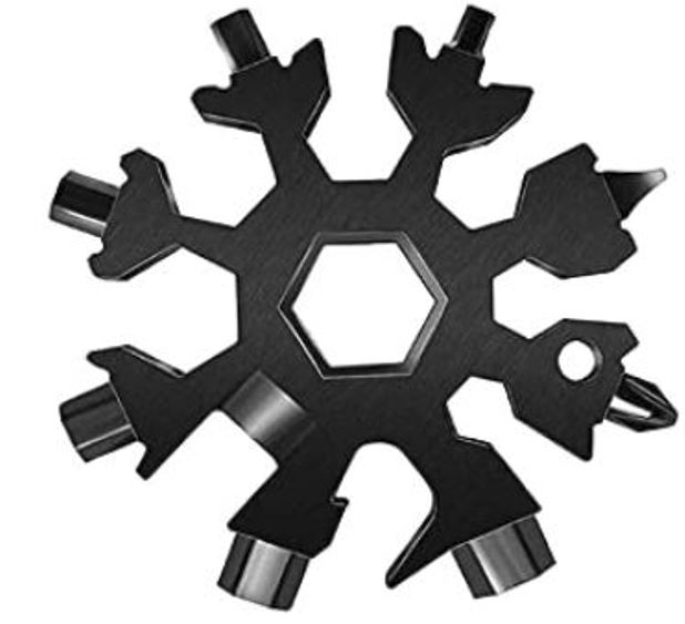 - 18-in-1 Snowflake Multi-tool: Slotted Screwdriver and Box Cutter, Rope Cutter, Bottle Opener, Key Hole, Phillips Screwdriver: Metric (millimeter) – 3; SAE (inch) – 1/8, Allen Wrench: Metric (millimeter) – 3-4-5-6-8-9; SAE (inch) – 1/8-5/32-3/16-1/4-11/32-6/16, Outer Hex Wrench: Metric (millimeter) – 7-8-9-10-11-13; SAE (inch) – 9/32-11/32-6/16-3/8-7/16-1/2 .